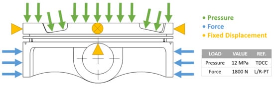 As explained before, the simplified model is based on a single load case, resuming the key elements of the four reference load cases. Figure 5 provides the loads and constraints definitions by analytical calculation and the FEM scheme setup on the different TSs. The load case is modelled in the worst case considering the maximum possible load related to engine working conditions (e.g., 12 MPa comb. pressure, 14,000 rpm).