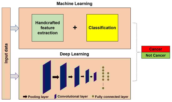 Block diagram showing the fundamental difference between working mechanisms of ML and DL algorithms for classifying images as cancer or non-cancer subtypes.