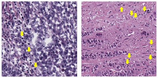 Microsatellites, which are also known as short tandem repeats (STRs), are tiny repeating stretches of DNA that are scattered across the entire genome region, accounting for approximately 3% of the whole region []. The MSI phenotype is one of the molecular changes that occurs in CRC, and it is also observed in different types of cancer, such as adrenocortical, rectal, colon, stomach, and endometrial tumors, and breast and prostate cancer []. MSI can also be referred to as a hyper-mutable phenotype that is an outcome of deficient mismatch repair (dMMR). In Figure 4, we can see MSI patches, indicated by yellow arrows, that show activations around the potential patterns of infiltrating immune cells. The identification of MSI status in CRC patients is crucial, because it helps to determine the presence of related diseases such as lynch syndrome, a highly penetrant hereditary cancer syndrome accounting for one-third of patients with MSI. Therefore, a less labor-intensive and broadly accessible MSI testing tool based on DL approaches has been studied lately. These CAD systems contribute an automated screening tool to triage patients when making clinical decisions, so as to identify differential treatment responses.