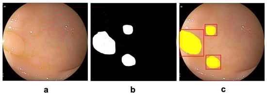 Polyp image samples. (a) original image, (b) corresponding annotation, and (c) detected polyps in the yellow regions.