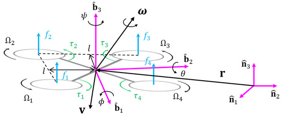 where is the inertia matrix, is the skew-symmetric matrix composed of the elements of the angular velocity vector (, and ), is the external torque, and is the gyroscopic torque generated by the quadcopter’s rotors. Here, is the inertia of the rotor, and is the sum of the rotors’ speed, which is defined as . Here, for 1, 2, 3, and 4 represents the rotation speed of the i-th rotor.