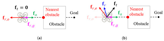 Note that is the attractive potential field and is the repulsive potential field. Also, is the direction from the quadcopter to the obstacle, and is the direction from the quadcopter to the goal position. When the goal position is under the influence of the repelling force, the quadcopter can arrive at the goal position because the repulsive potential field also contains which produces the potential field toward the goal position. That is, this term contributes to resolving the GNRON issue. By summing up two potential fields, the total potential field () is computed.