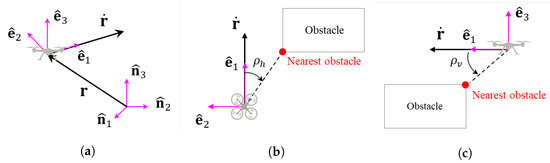 To determine the proper rotation matrices for the collision-free repelling direction of the repulsive potential field, this work considers the relative angles between the quadcopter’s velocity vectors and the relative position vector between the quadcopter and the obstacle in the horizontal and vertical planes. To obtain the relative angles, an additional reference frame (i.e., E frame) is defined using for 1, 2, and 3, as shown in Figure 3a. Note that is a unit vector that has the same direction along with the quadcopter’s velocity direction, and is defined as . Then, is determined by . Here, the E frame is not defined during take-off and landing because the CA algorithm is not activated during these phases. Then, the relative angle defined in the horizontal plane is shown in Figure 3b, and is defined in the vertical plane, as displayed in Figure 3c. Note that and provide the relative location of the obstacle from the quadcopter with respect to the horizontal and vertical planes, respectively. Based on this information, the rotation matrices to determine the avoidance direction are obtained by the criteria listed in Table 1.