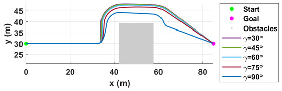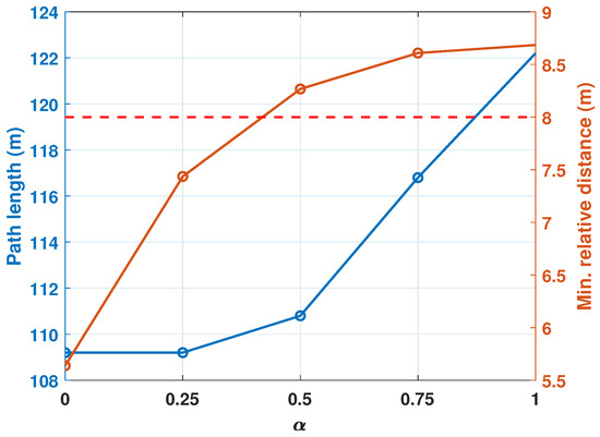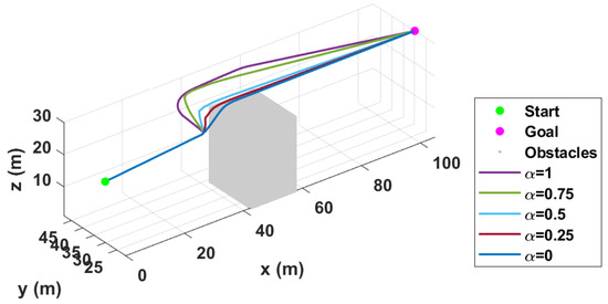 With the fixed deg, the next analysis is that of the effect of ’s changes. To analyze the vertical avoidance maneuver, the operational altitude of the quadcopter in this simulation is selected around the top height of the building. Similar to the analysis process for , Figure 6 describes the trajectories of the quadcopter with various values, and Figure 7 shows the total path lengths of the quadcopter and the minimum relative distances between the quadcopter and the nearest obstacle in accordance with . As changes, the degree of the portion of horizontal and vertical maneuvers on the planned trajectory also changes. Since the quadcopter operates near the top of the obstacle, the vertical avoidance maneuver (i.e., ) provides better performance than the others in terms of path length. However, when , the result is best, as shown in Figure 7, because the minimum relative distance it is required to maintain is greater than the safety margin (8 m).