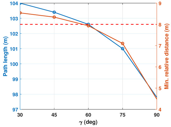 To analyze the effect of ’s changes, only the horizontal avoidance maneuver (i.e., ) was considered. The local minima situation was selected to test, and in this situation, the conventional APF approach cannot find the proper path, so the case does not need to be tested. Figure 4 shows the trajectories of the quadcopter with various values, and Figure 5 displays the total path lengths of the quadcopter and the minimum relative distances between the quadcopter and the nearest obstacle in accordance with . As increases, the quadcopter’s trajectory tends to approach the obstacles, and this result can be confirmed in Figure 5. The shorter the total path length, the lesser the energy consumption will be, by assuming the constant velocity-based operation for example. However, since too close a relative distance may cause a collision, a safety perspective must also be considered when selecting a value. This study assumed that the quadcopter is safe when the relative distance to the nearest obstacle is greater than 8 m. The minimum relative distance (i.e., safety margin) is highlighted with the red-dotted line in Figure 5. Here, the quadcopter may approach the obstacle closer than the safety margin if the dynamics of the quadcopter is considered. Furthermore, since the safety margin is 8 m, the quadcopter may collide with the nearest obstacle in 3 s when the quadcopter flies at a nominal velocity of 3 m/s. Based on this setting and information, deg is the best selection in this study, and the selection of deg results in the minimum relative distance of 8.3 m.