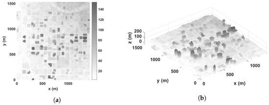 To test the proposed CA approach in realistic environments, a high-resolution urban area was simulated using real datasets measured by an airborne LiDAR. Since the open source urban data are available, this work utilized data obtained from Open-Topography (https://opentopography.org/, accessed on 17 October 2021). Note that LiDAR data (i.e., “*.las” file here) of San Diego downtown were selected as an example of 3D urban environments. The data are classified into x, y, and z components of a point cloud, and one filters out the data so that all of z is less than 200 m. The filtered point cloud data are visualized in Figure 8.