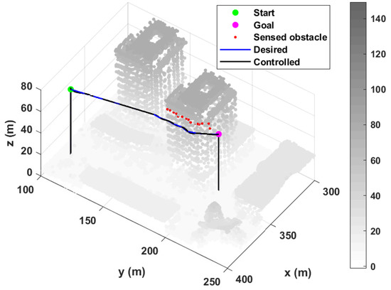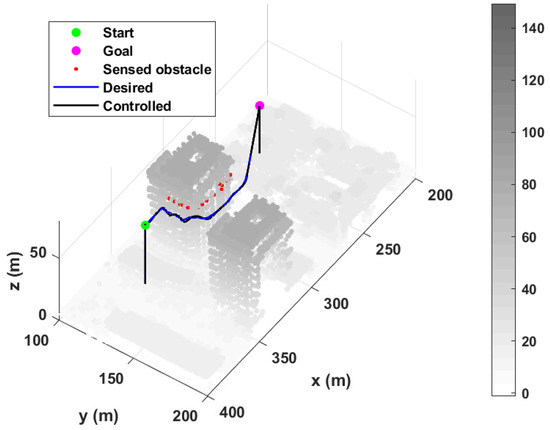 To validate the CA performance of the proposed approach, the numerical simulations of three scenarios in the selected urban environment were performed. The local minima and GNRON cases were chosen as the first and second scenarios, respectively, to highlight the fact that the proposed approach resolves the conventional APF’s well-known issues. The third case is a complex urban environment in the presence of multiple static obstacles (e.g., buildings). In addition, a quadcopter in this study is mounted on a 3D scanner (e.g., depth camera) to simulate practical sensing. By the 3D scanner, the point cloud of objects (i.e., obstacles here) existing within the sensing range and FOV of the sensor are measured. The simulation parameters for the quadcopter, sensor’s specifications, and control gains are listed in Table 3. Here, the quadcopter’s dynamics and control logic are considered, unlike in Section 3.1. Furthermore, the quadcopter’s diameter size was chosen based on information about the commercial drone’s specifications [22]. Moreover, this work assumed that the quadcopter maintains a constant nominal speed during operation. In addition, the parameters for the proposed CA algorithm listed in Table 2, and and values selected in Section 3.1 were used. For each case, the start and goal positions are tabulated in Table 4.