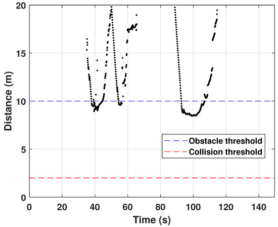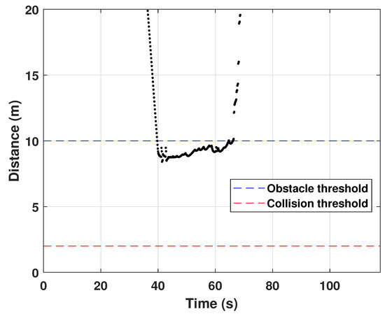 The last case is that of a complex environment with several static obstacles. In this scenario, the quadcopter must avoid three buildings to achieve the mission. Figure 13 shows the quadcopter’s 3D and 2D trajectories. The quadcopter mainly performs the horizontal avoidance maneuver near the first and third buildings and the vertical avoidance maneuver for the second building. Since the proposed approach combines the horizontal and vertical maneuvers, the quadcopter can successfully avoid several obstacles without collision. Figure 14 illustrates the relative distance from the quadcopter to the nearest obstacle between the sensing range of 20 m and the collision threshold of 2 m. The smallest relative distance can be observed at 8.5 m so that the quadcopter safely reaches the goal position without collision—even in the presence of multiple static obstacles within the limited 3D urban environment.