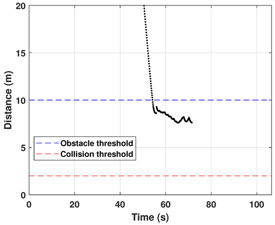 In Case 1, an obstacle point is located exactly between the start and goal positions. Figure 9 shows the quadcopter’s avoidance trajectory and the nearest obstacle point sensed by the 3D scanner at each simulation discrete-time. Note that the blue trajectory represents the desired trajectory obtained from the proposed CA algorithm, while the black one indicates the quadcopter’s actual trajectory. At every time step, the CA algorithm computes the desired position for avoiding obstacles, and the control logic mentioned in Section 2.2 uses the desired position calculated. Furthermore, Figure 10 depicts the relative distance between the quadcopter and the nearest obstacle point. In the trajectory figure, it is observed that there are slight changes in the quadcopter’s altitude near the obstacle, and this is because of the portion of the vertical avoidance direction inclusion. In addition, the relative distance during the maneuver remains greater than the collision threshold 2 m that represents physical collision. Note that the obstacle threshold of 10 m denotes the relative distance that activates the repulsive potential field, as defined in Table 2. Since the smallest relative distance is observed at 8.42 m, one can say that the quadcopter completes the mission safely.