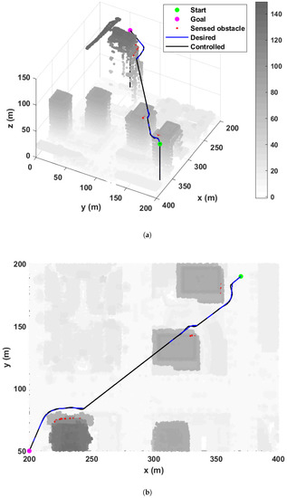In the formulation of the proposed algorithm, there are several free parameters that need to be determined by a user. In particular, and , which are the newly introduced parameters in this paper, are critical because they highly affect the performance of the proposed approach. Here, plays a role in determining the portion of each avoidance direction. For example, when , the quadcopter only performs a horizontal avoidance maneuver, and when , it only flies on a vertical plane. When the quadcopter’s operation altitude is less than the height of buildings (i.e., obstacles to the quadcopter) in urban areas, the horizontal avoidance maneuver is sufficient. However, when the quadcopter is operating near building tops, a combination of the horizontal and vertical maneuvers is preferable since the horizontal maneuver only may require a longer trajectory than the combined maneuvers. Therefore, needs to be properly determined between 0 and 1. In addition to this, directly affects the direction of , as shown in Figure 2. When deg, the proposed algorithm is performed as the same with the conventional approach. When is greater than 90 deg, (i.e., the repelling direction) is in the direction of the obstacle. This means that does not play a role in repelling the quadcopter anymore. Hence, is needed to be selected between 0 and 90 deg. These two parameters will be analyzed in the next section.