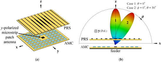 Overviews of the FPC antenna based on the proposed design method and its beam-scanning scheme are presented in Figure 1. The proposed antenna consists of a tapered PRS superstrate and an AMC ground plane, forming an FP cavity. By satisfying an FP resonance condition in the cavity and adequately adjusting the reflection phase of each AMC cell, the antenna can successfully produce a scanned beam with fairly high gain in the desired target direction of θ = 30° on the xz-plane (ϕ = 0°). For a feeding antenna, a y-polarized microstrip patch antenna is employed instead of a slot antenna or others for easy fabrication [19].