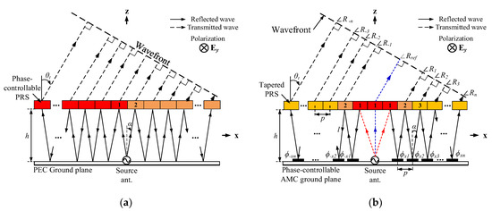 where β is the propagation constant in free space, h is the height of the PRS, p is the period of each PRS and AMC cell, l is the length of a ray path between the AMC and PRS, ϕ±xn is the reflection phase of each ±nth AMC cell, and ∠Γn and ∠Τn are the reflection and transmission phases of the ±nth PRS cell, respectively. The cell number n is represented in Figure 2.