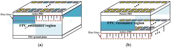 Overviews of FPC antennas consisting of (a) an active PRS and (b) an active AMC. It is desirable for the bias lines to be placed beneath the ground plane as they hardly affect the FP resonance in the cavity.