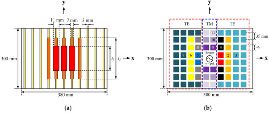 Now, we move on to the AMC ground plane in Figure 4b, which is employed for the aforementioned phase control. The AMC ground plane consists of 76 unit cells arranged with a period p of 35 mm. Each AMC cell has the required reflection phase calculated by (3) and (4) at the design frequency, and their corresponding lengths are listed in Table 1. In Figure 4b, the same-colored cells have the same reflection coefficients, and there are eleven different colors in total. In addition, since the proposed antenna is designed for a scanned beam along the x-axis, the phase distribution of the cells is symmetric with respect to the x-axis. In Figure 4, the regions enclosed by the red and the blue lines are related to polarization modes incident on the cells, which will be explained in the following subsection in more detail.