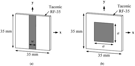 Figure 6 represents the configuration of the PRS and the AMC unit cell. Both of them employ a Taconic RF-35 substrate of thickness 1.52 mm with dielectric constant εr = 3.5 and loss tangent = 0.0025. The PRS cell consists of a copper strip parallel to the y-axis and a fully etched opposite backside. On the other hand, the AMC cell is comprised of a square patch etched on the substrate whose backside is entirely covered with copper. In both cells, the required reflection or transmission phases can be obtained by changing the widths of the patches (w and a in Figure 6).