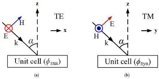 Unit cell simulations for two different incident modes of (a) a transverse electric (TE) and (b) a transverse magnetic (TM) with the incidence angle α.