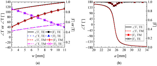 The unit cell simulations for two different incident modes of a transverse electric (TE) and a transverse magnetic (TM) with the incidence angle α are illustrated in Figure 7. As briefly aforementioned in Section 2.1, when determining the reflection or transmission phases of the PRS and the AMC cell, we should take into account both the incident angle and polarization. In our antenna, the incidence angle is fixed at 19° by the antenna height h = 50 mm and the unit cells’ period p = 35 mm. When it comes to the incident polarization, we have supposed that a TE field is incident on the cells in the region surrounded by the red lines in Figure 4, whereas a TM field is incident in the region enclosed by the blue lines according to the y-polarized feeder antenna.