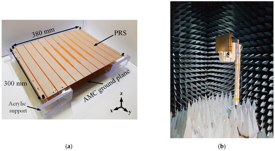 (a) The fabricated FPC antenna that consists of the PRS superstrate and the AMC ground plane with four acrylic supports and (b) its measurement environment.