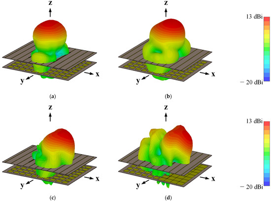 Simulated 3D radiation patterns for each scanned beam at the designed frequency. All target directions are on the xz-plane (ϕ = 0°): (a) θt = 0°, (b) θt = 15°, (c) θt = 30°, and (d) θt = 45°.