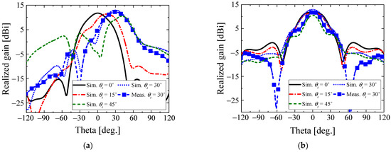 Impedance matching results for different scan angles are plotted in Figure 10. To confirm that our idea is still valid for other beam-scan directions but θt = 30°, we have conducted additional simulations for θt = 0°, θt = 15°, and θt = 45°. As shown in Figure 10, the −10 dB bandwidths are well maintained for the most cases. However, we can find that the impedance matching is slightly deteriorated for θt = 45°. This is owing to the large variation of reflection phases of AMC cells compared to the other cases, which needs to be further improved in future works. A little discrepancy between the simulated and the measured results for θt = 30° is caused by the limited fabrication tolerance, which is significantly influential for our antenna.