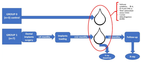 - Liskmann, S.; Vihalemm, T.; Salum, O.; Zilmer, K.; Fischer, K.; Zilmer, M. Correlations Between Clinical Parameters and lnterleukin-6 and lnterleukin-10 Levels in Saliva from Totally Edentulous Patients with Peri-implant Disease. Int. J. Oral Maxillofac. Implants 2006, 21, 543–550. [Google Scholar] [PubMed]