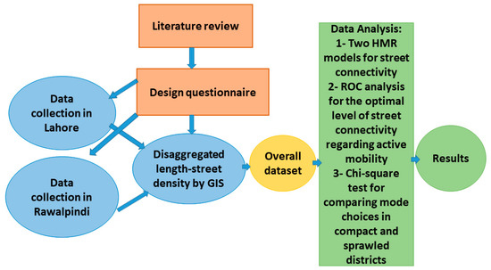 In this paper, we hypothesize that there is a correlation between street-length density (as a proxy for urban sprawl and an indicator of the street network) and travel behavior, including the number of commuting and non-commuting trips, the use of private motor vehicles in commuting and non-commuting trips, commuting distance, and the frequency of public transport use in two large Pakistani cities: Lahore and Rawalpindi. Also, we hypothesize that there is a minimum level of connectivity of the street network that leads residents to choose walking and cycling for commuting as well as non-commuting purposes. Nevertheless, residents who live in sprawled neighborhoods may choose a different mode of transportation for commuting and non-commuting trips compared to those who live in compact districts of these cities. The different steps for reaching this paper’s aims are shown in Figure 1.