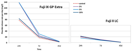 - Mousavinasab, S.M.; Meyers, I. Fluoride release and uptake by glass ionomer cements, compomer and giomer. Dent. Res. J. (Isfahan) 2009, 6, 75–81. [Google Scholar]