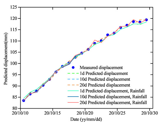 In the network structure designed in this paper, the genetic algorithm runs for 50 generations, and the other control parameters are set as follows: population size: 40, crossover rate: 0.7, mutation rate: 0.01, individual binary code length: 10. According to the GA-Elman workflow introduced in 2.2, the first 97 days between 6 July 2020 and 30 October 2020 are selected as the training set, and the last 20 days of monitoring data are selected as the test set. Considering the rain factor and the non-rainfall factor respectively, the rolling forecast method is used to predict the displacement deformation trends for 1 day, 10 days and 20 days, respectively.