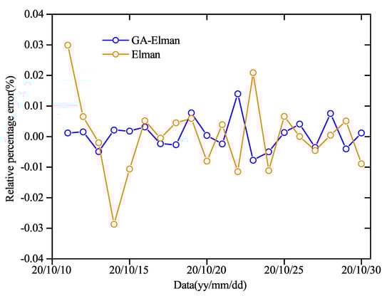 Relative percentage error of prediction with GA-Elman and Elman models.