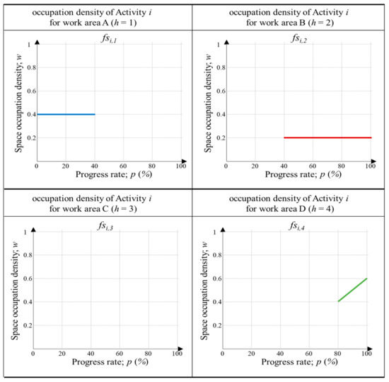 Figure 3 is a simple example of explaining the concept of the occupation density function. It is assumed that the work area (h) was divided into four areas (A, B, C, and D) in Step 3. Activity i is executed by occupying the A work area until the rate of progress is 40%, and the area occupation density is 0.4. After the progress rate of 40%, work area B is occupied at 0.2 density. After 80%, work area B is occupied at a density of 0.2, and simultaneously, work area D is occupied. However, the occupation density of work area D increases at a constant rate from 0.4 to 0.6. Work area C is not occupied, while activity i is executed. Occupation density functions can be defined in various ways according to the characteristics and work areas of the activities.