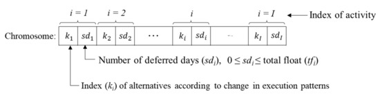 SSO uses two strategies for minimizing space interference. The first is selecting an alternative for the execution patterns of each activity, and the second is deferring the start times (sti) of noncritical activities (NCP). GA chromosomes are composed of a set of genes. In SSO, the GA chromosome is composed of a pair of the index (ki) of the alternatives of execution patterns for activity (i) and the number of deferred days (sdi) of the start time for the activity (i) (Figure 4). The index (ki) of alternatives of execution pattern is smaller than or equal to the number of alternatives (Ki) of occupation density function for activity i found in Step 6 (ki≤Ki). The number of deferred days (sdi) is always zero if activity i is a critical activity (sdi = 0, i⊄NCP), and it is smaller than or equal to the total float (tfj) found in Step 9 if activity i is a noncritical activity (sdi≤tfj, I ⊂ NCP). The serial number of a gene pair is the same as the index (i) of activity. The search range of the optimal solution (SS) is the number of combinations of the execution pattern alternatives and the range of deferrable days of activities (Equation (9)).