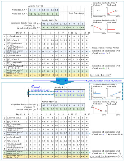 By using a simple example with two activities, P and Q, and two work areas, A and B, Figure 5 shows the procedure for calculating the level of space interference and the procedure in which the level of space interference changes with the application of alternatives for execution pattern and deferred start time of activity P.