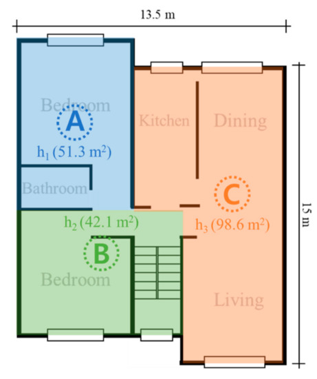 The activity-on-node network consisting of 13 activities shown in Figure 6 was used to illustrate the procedure described in the preceding section and allows us to validate each step of the SSO method in detail. The case study is a network for electrical and mechanical work on a site with the floor plan as shown in Figure 7. The schedule information is stored in Table 1 with the activity index (i), activity duration (Di), the number of workers per day (ri) assigned to an activity, the number of equipment per day (ei), required amount of material (mi), required temporary facilities (fi), and predecessor (PSi), etc. The case site was divided into three specific work areas (h), and their area size were 51.3 m2, 42.1 m2, and 98.6 m2. The occupation density function (fs) for each activity was found by considering the resources needed to execute the activity and the characteristics (e.g., location and area size) of specific work areas (Table 2). The number of alternatives for occupation density function (fs) obtained by changing the execution pattern of activity (i) were [3, 2, 2, 1, 4, 2, 1, 2, 2, 1, 2, 2, 3]. The CPM computes the critical path and total project completion time as A- > D- > L and 66 days, respectively. The non-critical activities (NCP) are B, C, E, F, G, H, I, J, K, and M. The total floats (tfi) of activities were [0, 8, 17, 0, 9, 8, 9, 8, 17, 27, 8, 0, 27]. Therefore, based on Equation (9), the size of the optimal solution search range in this test case was