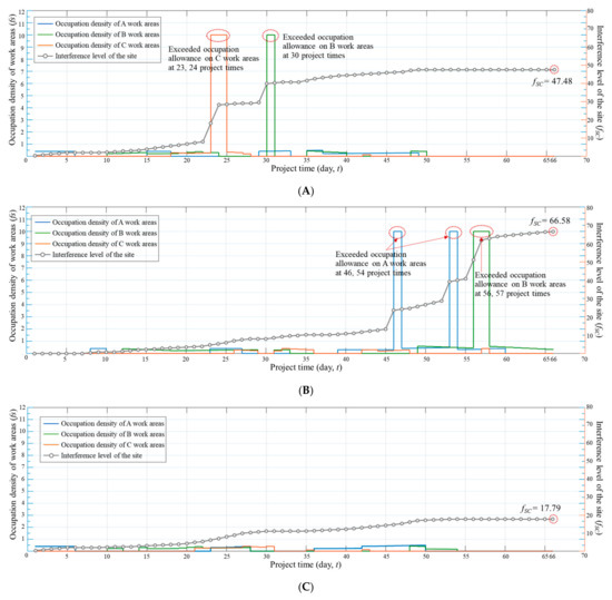Occupation density of work areas and level of space interference obtained original schedule and SSO method. (A) Original schedule (based EST). (B) Original schedule (based LST). (C) After optimizing schedule using SSO.