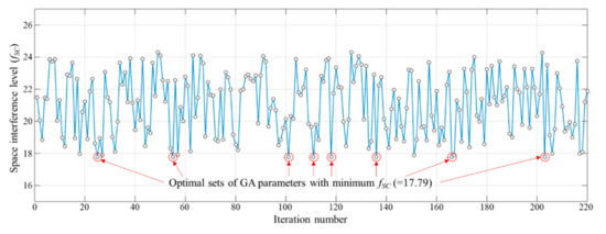 The performance of GA can be changed depending on the values chosen for the GA parameters. Therefore, performing GA once with only one set of GA parameters cannot guarantee the reliability of the obtained results. In order to improve reliability, the sensitivity analysis was performed as follows. This analysis starts by setting the minimum, incremental, and maximum value of each GA parameter (i.e., population size (PS) = [PSmin:IPS:PSmax] = 300:20:500), crossover rate ((CR) = [CRmin:ICR:CRmax] = 0.4:0.1:0.8), and mutation rate ((MR) = [MRmin:IMR:MRmax] = [0.05:0.01:0.08]). In this example, there are 11 population sizes (300, 320, 340, 360, 380, 400, 420, 440, 460, 480, 500), 5 crossover rates (0.4, 0.5, 0.6, 0.7, 0.8), and 4 mutation rates (0.05, 0.06, 0.07, 0.08). Therefore, a total of 220 (=11 × 5 × 4) GA experiments are conducted, and the experimental results are saved along with the space interference level (fSC) and the number of evolved generations (g). The results are shown in Figure 9. The results of sensitivity analysis present that the interference level (fSC) is the minimum of 17.79, and the maximum is 24.35. The minimum fsc was searched for eight parameter combinations, [320-0.5-0.05], [340-0.7-0.07], [400-0.4-0.05], [400-0.6-0.07], [400-0.8-0.06], [420-0.7-0.08], [460-0.5-0.06], and [500-0.4-0.07], respectively. It was confirmed that the obtained results with the initial set of GA parameters (i.e., PS = 400, CR = 0.4, MR = 0.05) were the optimal solution.