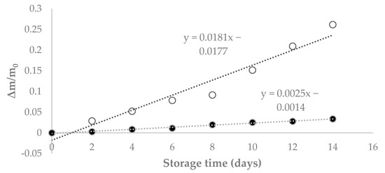 Figure 2 shows the weight loss experienced by coated and uncoated strawberries stored at 25 °C and 85% RH for two weeks. From the first days of storage, it was observed that the coated strawberries lost weight in a less accelerated way than the coated strawberries. As of day 8, uncoated strawberries show an acceleration in weight loss. This weight loss is directly related to the moisture request of the fruits. As seen in the water vapour permeability test, the films with essential oils had lower WVP than the control. Thus, the graph shows that the weight loss in uncoated strawberries was 26.2 g of water/100 g of fruit, and in coated strawberries, 3.3 g of water/100 g of fruit. It was possible to reduce 22.8 g of water/100 g of fruit from the weight loss using coatings. Similar studies have indicated that the weight loss of fresh strawberries is due to water loss [48]. Furthermore, coating thickness and porosity have been shown to affect gas and water exchange [49]. Cai et al., 2020 found that mangoes treated with a starch film containing thyme essential oil microcapsules after 10 days of storage had a lower weight loss than those without film, extending the weight loss of mangoes within a specific range. These results suggested that films and coatings play an essential role as a water barrier between the fruit and the environment throughout the storage period [36].