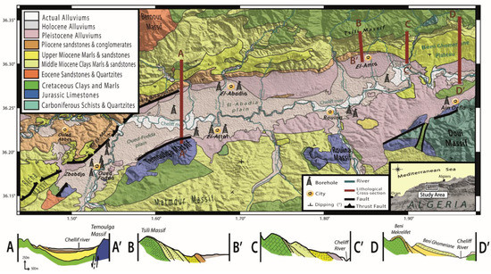 32]. The Pliocene constitutes the principal deposits of the Sara-el-Maarouf and the Sara-Belaggoune anticlines, north of Oued-Fodda, and extends eastward by outcropping on a narrow band until the Beni-Ghomerian Plateau. However, this formation does not outcrop in the southern parts of the basin, which suggests that it disappears somewhere under the Quaternary plain. These deposits can reach a thickness of 200 m [