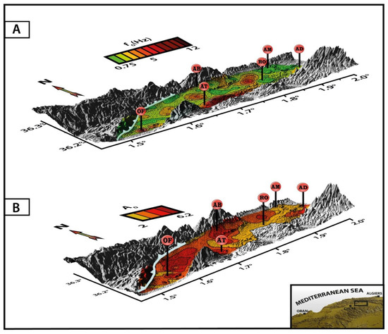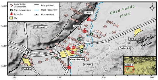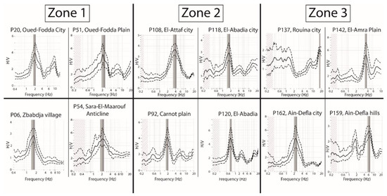 22]. In the village of Zbabdja, about 3 km west of Oued-Fodda city, the frequencies are around 1.5 Hz. In terms of shape, two types of curves are observed in this zone: curves with two frequency peaks are predominant in the Oued-Fodda Plain, while curves with one peak were obtained only from recordings in the central parts of Oued-Fodda city and Zbabdja village. Second peaks at higher frequencies are related to impedance contrasts in the soil column at shallow depths [