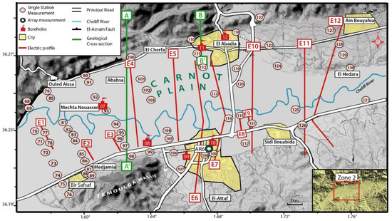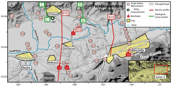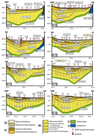 18]. These boreholes allowed us to fix the thicknesses of the Quaternary and Pliocene layers in some areas. In order to complete the lack of data and to obtain information on deeper layers, a total number of 13 electrical profiles were added. Nine of them were made by the General Company of Geophysics between El-Attaf and Ain-Defla [