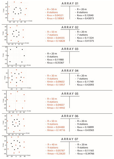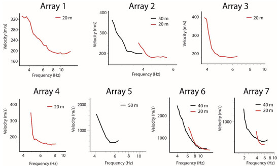 Figure 10, the dispersion curves estimated from the different deployed arrays are shown. In some places, a single array was enough to obtain a reliable dispersion curve, while, in other places, two arrays of different apertures were implemented, obtaining an average dispersion curve. The frequency range is fixed by the theoretical wavenumber limits (K