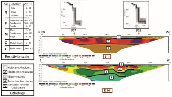 For the resistivity profile (E1), the depth of the investigation of 115 m allowed for the identification of the two Quaternary layers. The thicknesses of these two layers (1 and 2 in
