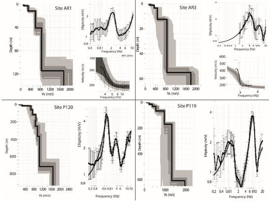 The inversion of the obtained HVSR curves allowed for the retrieval of the S-wave velocity models at each site. For sites where array measurements were also taken, the joint inversion of the obtained dispersion and HVSR curves was carried out. The number of analyzed layers, as well as the range of the respective Vs and thickness parameters, have been constrained according to previous information obtained from geological cross-sections, boreholes, and geotechnical studies (see