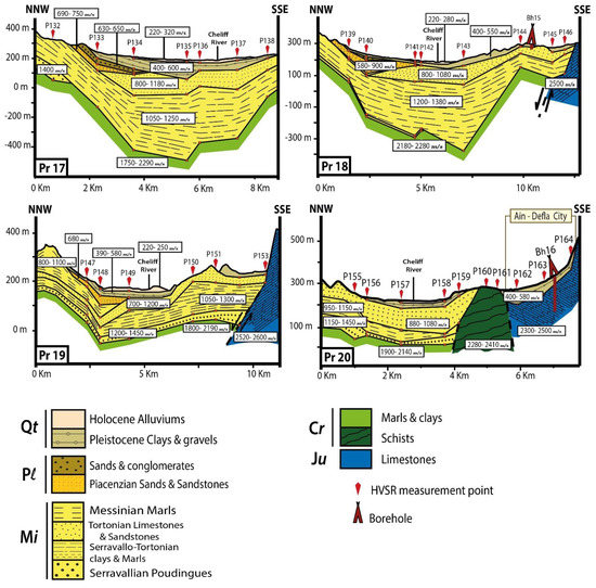 Figure 2). North of the city of Ain-Defla (Profile Pr 20), the Albian clays and marls are separated from the Jurassic limestones by a block of Neocomian schists, which belongs to the Arib Massif that overlooks the Upper-Chelif Plain. The presence of the Neocomian schists marks the transition between the Middle and Upper Chelif Basin. The Vs values for this formation vary between 2280 and 2410 m/s.