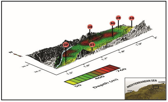 7]. The highest depths of the basin are observed around the city of El-Abadia, with a maximum depth of 760 m (P120 in Profile Pr14,