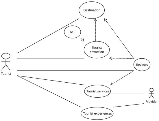 The domain of the ontology is the TTS with four main branches: Provider, Tourist Experience, Destination, and Tourist (see Figure 2 and Figure 3). Understanding these branches avoided any inconsistencies between the classes and the ontology. In addition, these branches responded to the requirements of tourism traceability: Where are the tourists (Destination)? What do tourists do (Tourist Experiences)? Who offers the experiences (Provider)?. From these branches were derived the classes that make up the TTS domain. The POIs and the tourist reviews are important because they implemented the space–time relationship to answer questions of the domain: When and where does the tourist consume the experience, or what is the tourist’s opinion of the experience?