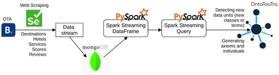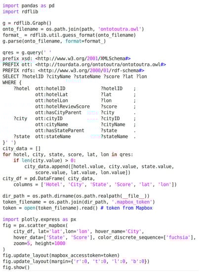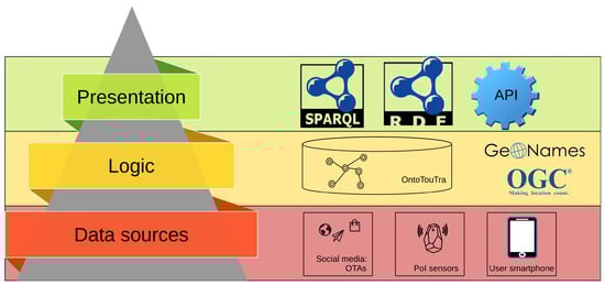 Regarding the logic model, the OntoTouTra architecture is multilayered based on functionality (see Figure 3, Section 3.4). As mentioned above, this architecture operates in Big Data environments, wherein the lower layers use data-mining techniques to process data from ubiquitous data sources. In the upper layer, the ontology offers different data recovery possibilities, such as the traditional SPARQL queries from an endpoint and REST API requests, the implementation of which can be seen in the screenshots of the Supplementary Material. Taking advantage of these ontology query possibilities, we handled scripts in programming languages, especially Python, to perform complex queries with Big Data analytics techniques, using the PySpark and PyMongo libraries.