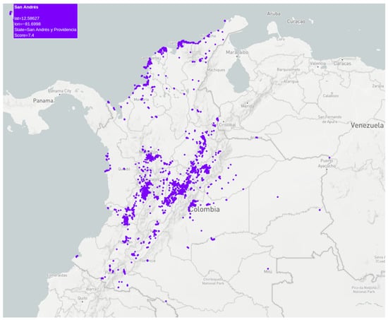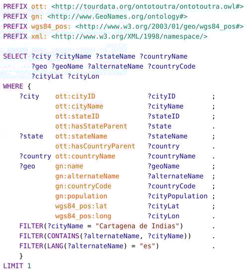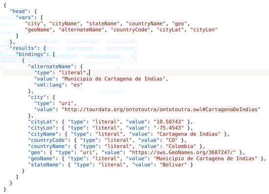 The GeoNames ontology [37] allows adding semantic data to the World Wide Web. It has more than 11 million toponyms with a single URL (RDF web service). The ontology of GeoNames is available in OWL as a database dump and also as open data linked in RDF [38]. Geographic levels in GeoNames [39] vary according to the country, for example, Germany has six levels, France five, and Colombia four. Therefore, it was necessary to resort to national data providers; for the Colombian case, the National Administrative Department of Statistics (DANE) provides the DIVIPOLA system [40]. Thus, we can provide more data about the location of a person, hotel, or tourist attraction (POI).