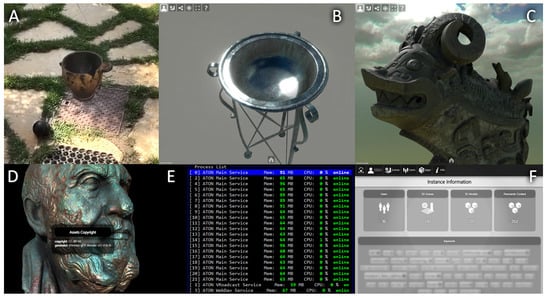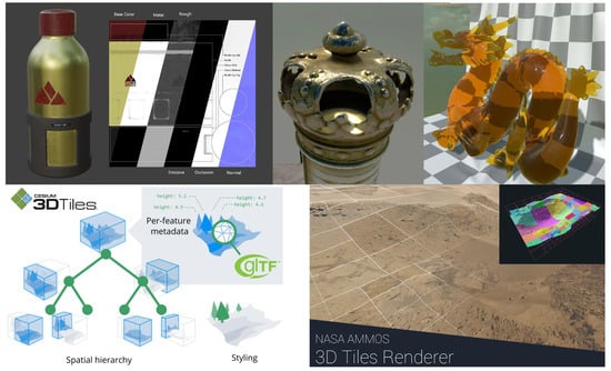 Top row (from left to right): water bottle sample with PBR materials from Khronos glTF samples, detail of a public domain CC0 model from Malopolska’s Virtual Museums (https://sketchfab.com/WirtualneMuzeaMalopolski, accessed on 22 November 2021) and support for real-time volumetric refraction and absorption (sample glTF model “Dragon” by Khronos). Bottom row: Cesium 3D Tiles specification and NASA AMMOS open-source 3D Tiles renderer.