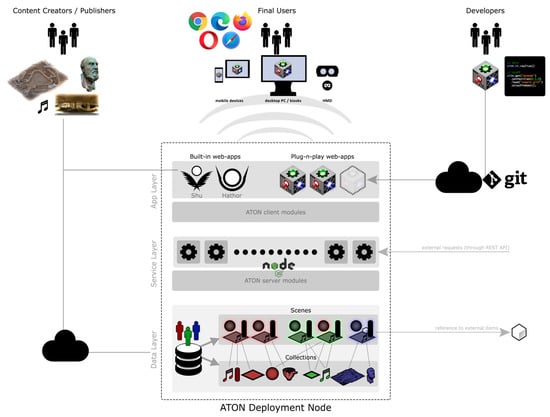 The overall design of the framework is conceived to be highly modular, in order to accommodate different scenarios and requirements of museums, institutions, researchers, professionals and other audiences intending to deploy interactive 3D experiences through a wide range of hardware. The ATON architecture and its components are the product of national and international projects, experiences and user feedback gathered during the last 5 years, which allowed the framework to evolve into the current state (version 3.0). The very first version (1.0) was developed under the ARIADNE European project [49] for visualization of large 3D landscapes online [50]. Regarding presentation layer (client-side), the framework stands on the shoulders of open-source 3D libraries (such as Three.js) leveraging modern standards such as WebXR to present rich, immersive 3D experiences to final users. Service layer (server-side) stands on top of Node.js and several modules (Express.js, socket.io, Passport.js (http://www.passportjs.org/, accessed on 22 November 2021) and others) to provide scalable network services handling 3D content streaming, user authentication, collaborative sessions and much more. Specific focus for ATON was placed on ease of deployment, scalability, interoperability, out-of-the-box tools and presentation features for CH stakeholders, while offering a simple but powerful API to developers.