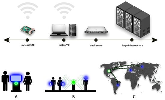 We first define the Deployment Node (DN) as the virtual or physical machine where one instance of the ATON framework is deployed. Thanks to Node.js portability and network scalability, a wide range of hardware solutions can be employed as DN (see Figure 3, top). These range from low-cost single board computers (like a Raspberry Pi (https://www.raspberrypi.org/, accessed on 22 November 2021)), up to laptops/PCs in local networks (e.g., classrooms), up to small servers or large infrastructures available over internet connection, with world-wide reachability. Depending on requirements and specific demands, this also allows the entire framework to be deployed on all existing cloud services that support Node.js like Google Cloud (https://cloud.google.com/, accessed on 22 November 2021), Amazon Web Services (AWS) (https://aws.amazon.com/, accessed on 22 November 2021), Heroku (https://www.heroku.com/, accessed on 22 November 2021) and many more.